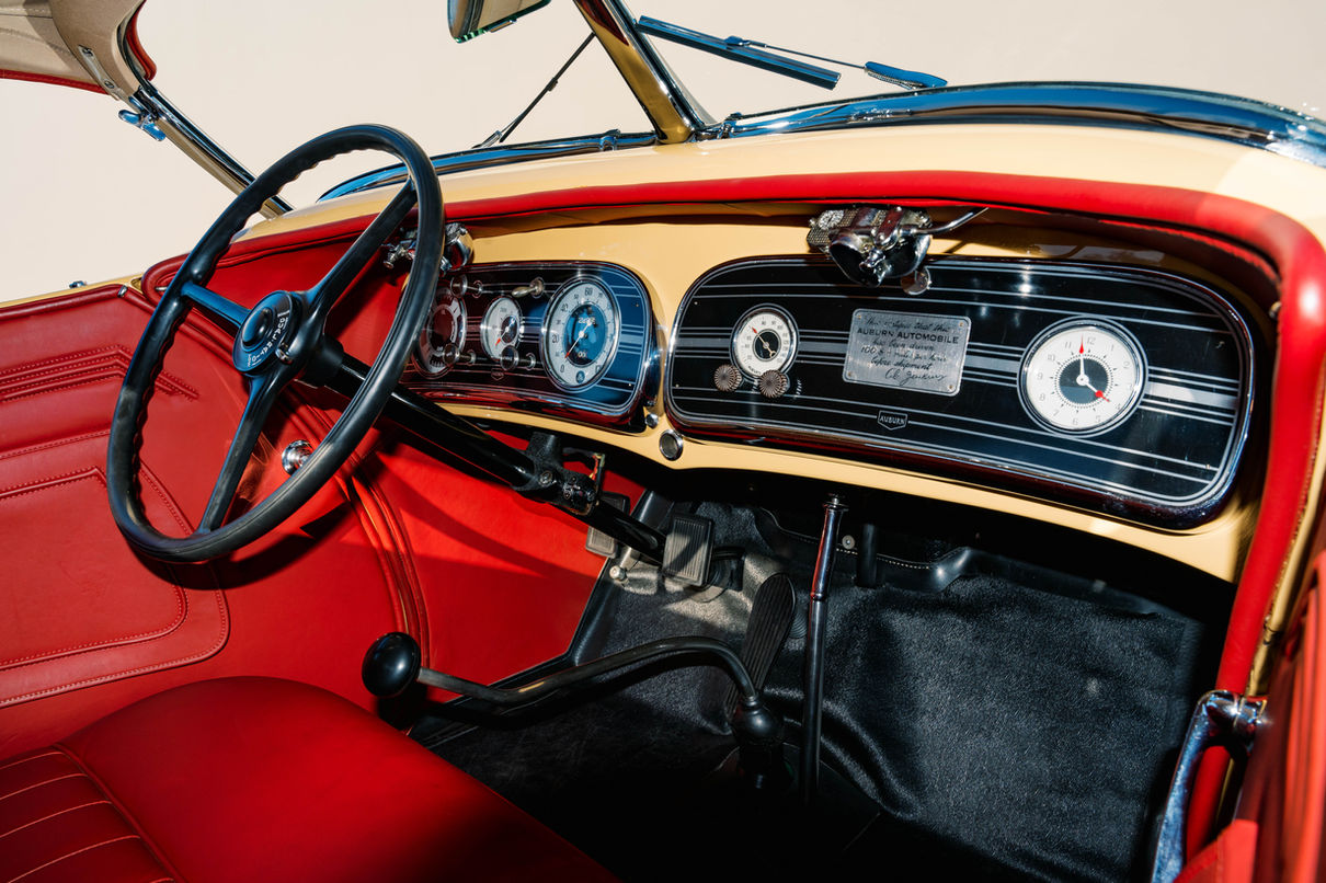 Created by the renowned Gordon Buehrig, the Auburn speedsters from 1935 to 1936 were bold and innovative for their era, showcasing sleek bodywork with a straight hood extending back from the radiator to a sharply angled windshield, flowing down between pontoon fenders, over subtly sloping doors, and tapering gracefully to the rear bumper. The distinct rear design of these speedsters, adorned with chrome accents and detailing, earned them the enduring moniker of "the Boattail." Beneath the surface, the high-performance car shared similar sophisticated mechanical components to other supercharged Auburn models. The shining chrome side exhaust indicated the presence of the Schweitzer-Cummins supercharger, enhancing the horsepower of the Auburn straight-eight engine to 150 from its original 115. This increased power was transmitted to a Columbia dual-ratio rear axle, offering two different gear ratios - one for low speeds and one for high speeds. The 851 Speedster was marketed heavily as being certified to achieve speeds of over 100 miles per hour when new.