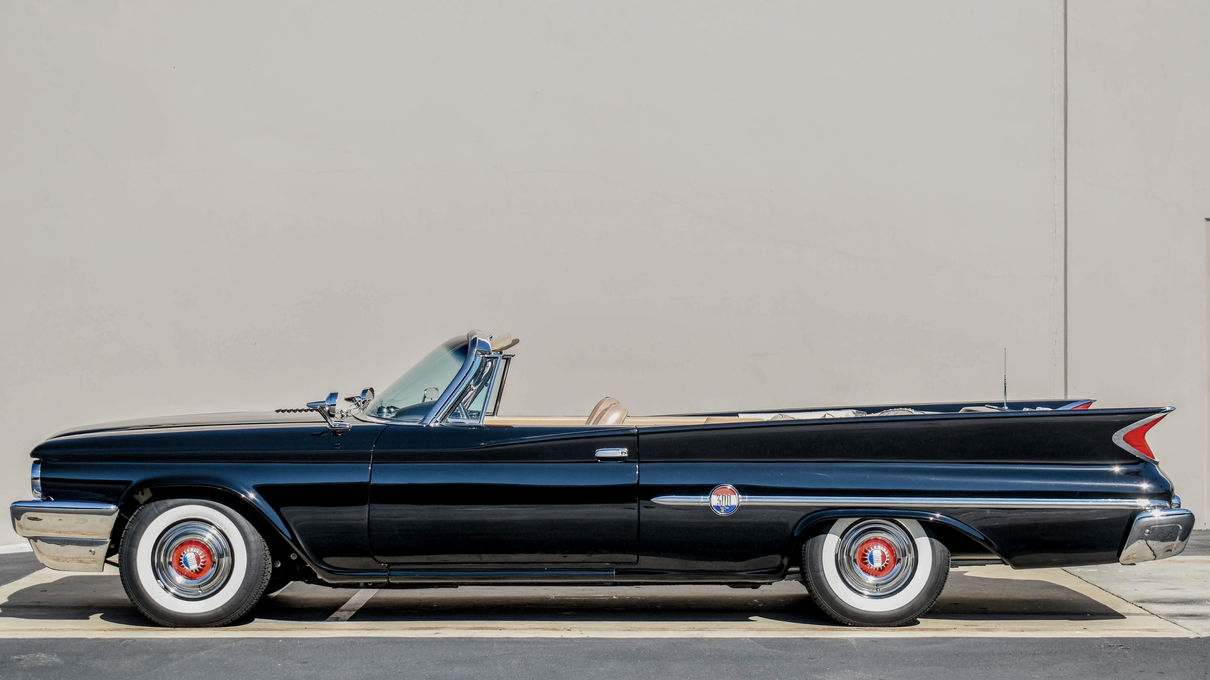 This innovative vehicle featured a 375 horsepower version of the 413 cubic inch Wedge Head V8 engine that was first introduced in 1959. In order to increase power at low and mid-range, a unique intake manifold was designed. Instead of the standard V8 engine central intake manifold with carburetors on top, the cross-ram manifold had two pairs of 30-inch long tuned pipes that crossed over each other so that each pair fed the opposite side of the engine. The carburetors and air filters were located on the sides of the engine hanging over the fender wells. These intake runners were acoustically tuned so that resonances in the air column helped push air into the cylinders. This example, finished in “Formal Black,” features the push-button TorqueFlite automatic transmission, which was offered as an option for the 300F, and is one of the rare convertibles produced.